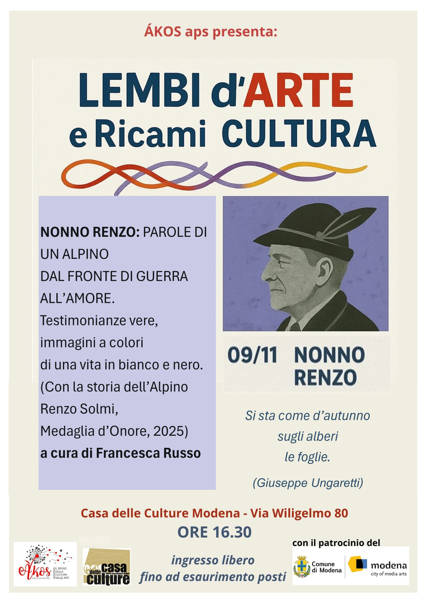 Nell’ambito della rassegna Lembi d’arte e Ricami di cultura, Àkos aps presenta: