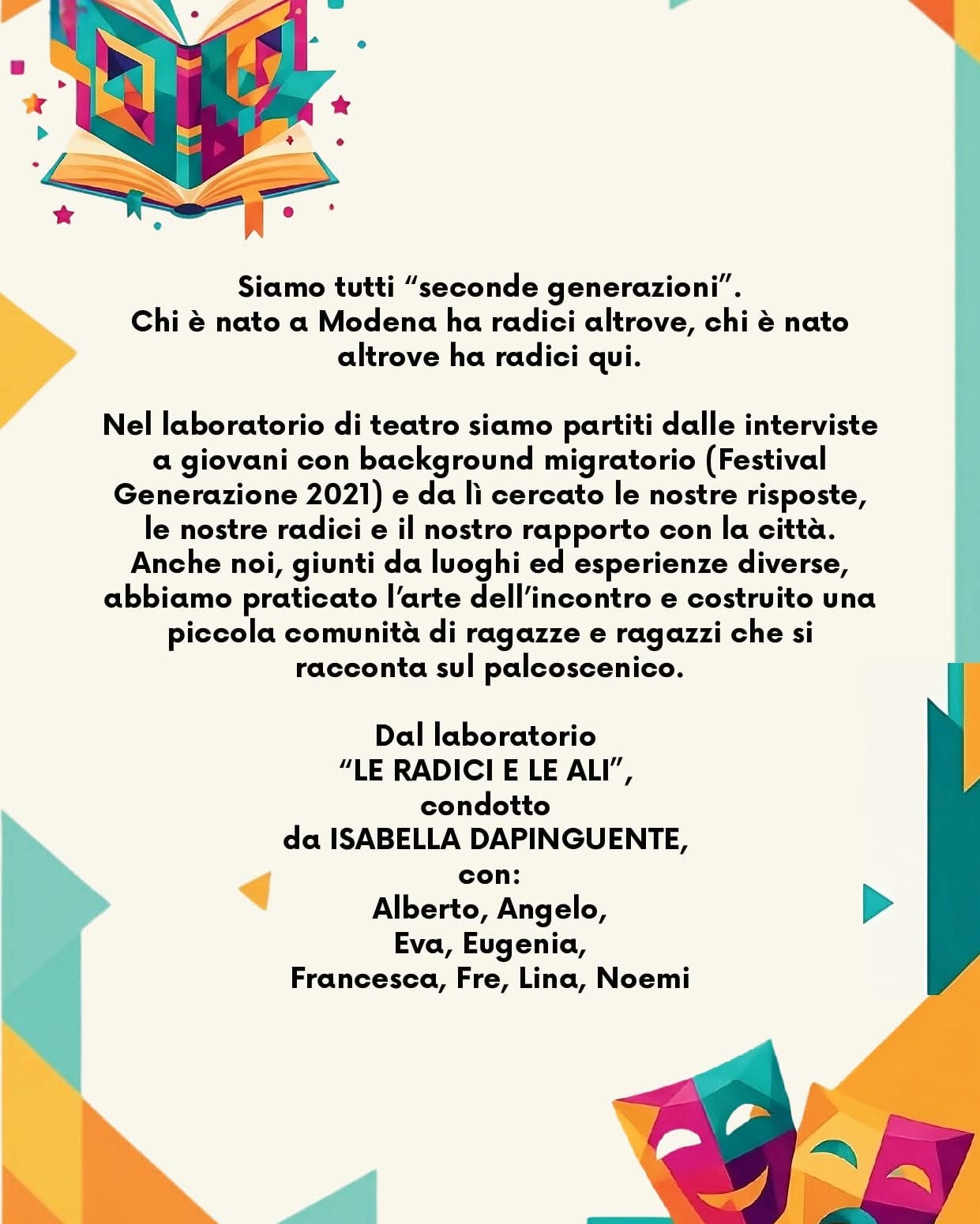 Lo spettacolo è frutto del laboratorio “LE RADICI E LE ALI”, condotto da ISABELLA DAPINGUENTE, con la partecipazione di Alberto, Angelo, Eva, Eugenia, Francesca, Fre, Lina, Noemi. 12 incontri di laboratorio teatrale in cui un gruppo di adolescenti, con l’aiuto di una regista che collabora con la Casa da alcuni anni, hanno elaborato un copione a partire da una serie di interviste realizzate durante il Festival Generazione del 2021 con giovani con background migratorio. Gliincontri sono stati incentrati, oltre che sulla coesione del gruppo, sul miglioramento della comunicazione e dell’uso della voce, e sull’arricchimento del copione con le proprie esperienze.