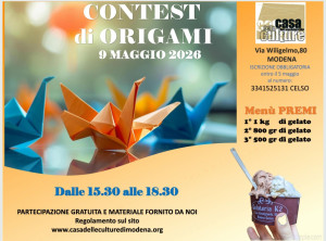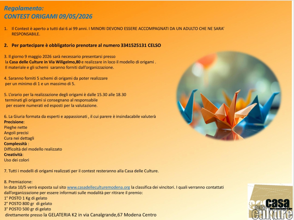 3. Il giorno 9 maggio 2026 sarà necessario presentarsi presso la Casa delle Culture in Via Wiligelmo, 80 e realizzare in loco il modello di origami. Il materiale e gli schemi saranno forniti dall’organizzazione.
